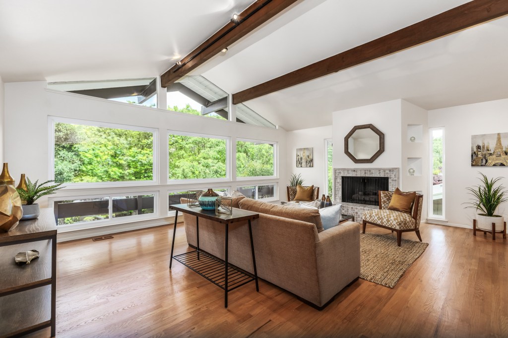 Dramatic living room off formal entry with gorgeous vaulted ceiling, gas fireplace flanked by windows and a stunning wall of windows taking in the beautiful vista.