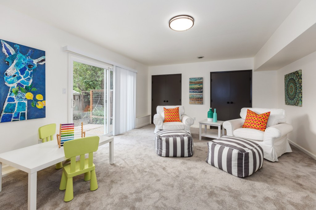 Spacious downstairs bonus room great for an office or playroom with built-in shelving, closet space and a sliding glass door to the side yard.
