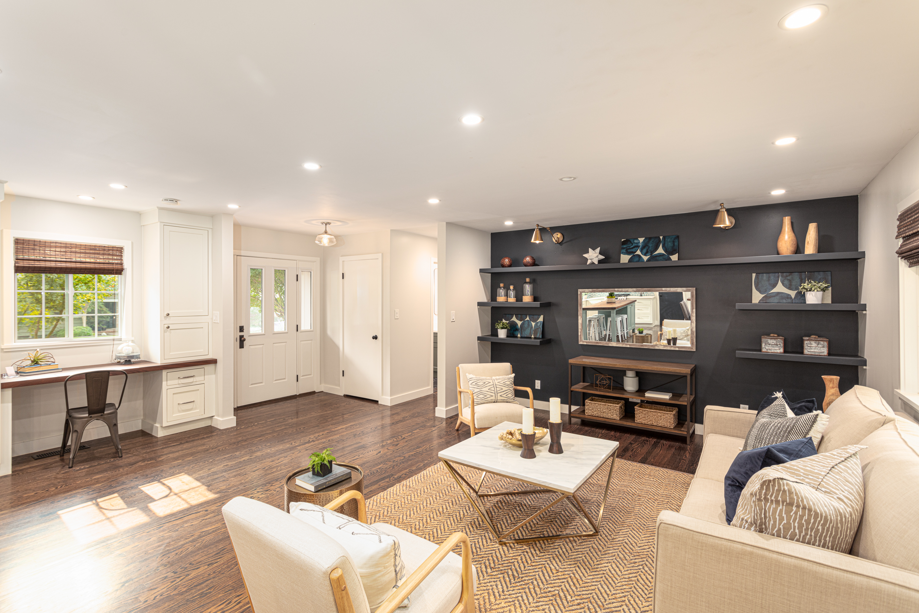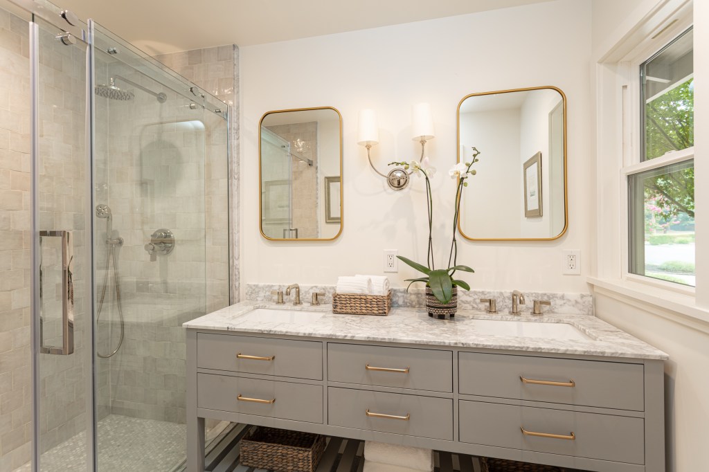 - Elegantly remodeled primary bathroom with sliding barn door