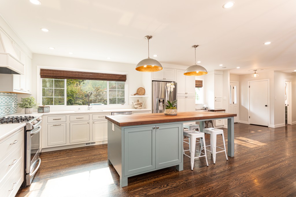- Sun-drenched kitchen open to the great room with stainless steel appliances including double Dacor ovens and gas range, refrigerator with white panel front, breakfast bar with two lovely sconces above and a skylight drawing in an abundance of natural light